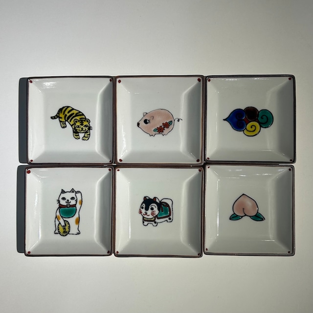 おめでたい柄 九谷焼の角小皿 寿ぎ 全部で22種類あります こちらでは6種類ご覧いただけます 醤油皿、おつまみ用 アクセサリー置きに 飾り皿としてもオススメです W9 D9 H2 電子レンジ 可 オーブン 不可 食洗機 不可